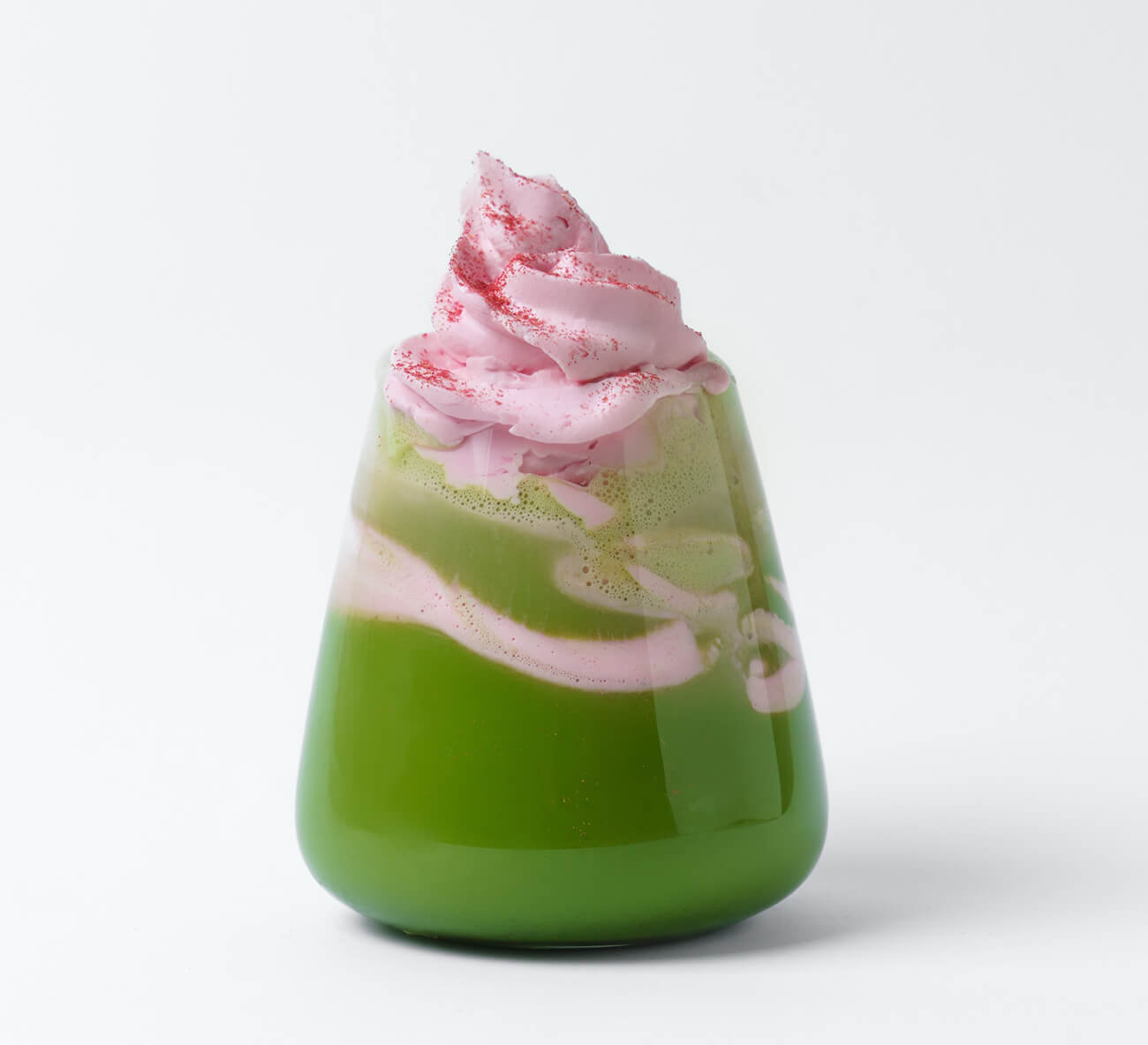 3. Încălziți și spumați 200ml de lapte. Turnați matcha într-un pahar și adăugați laptele spumat peste. 4. Adaugă amestecul de frișcă peste cu un poș pentru frișcă sau o lingură